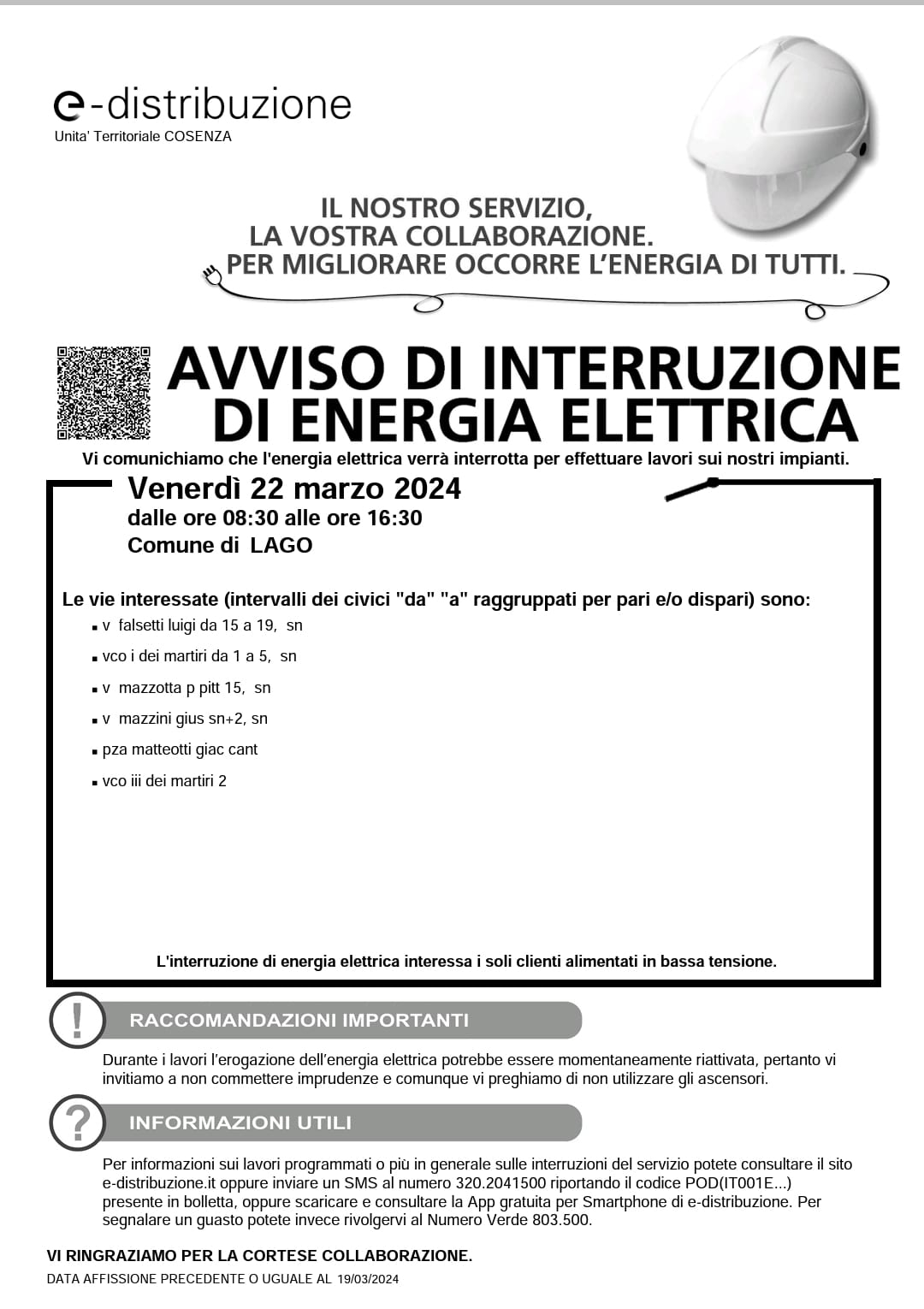 AVVISO DI INTERRUZIONE ENERGIA ELETTRICA GIORNO 22.03.2024