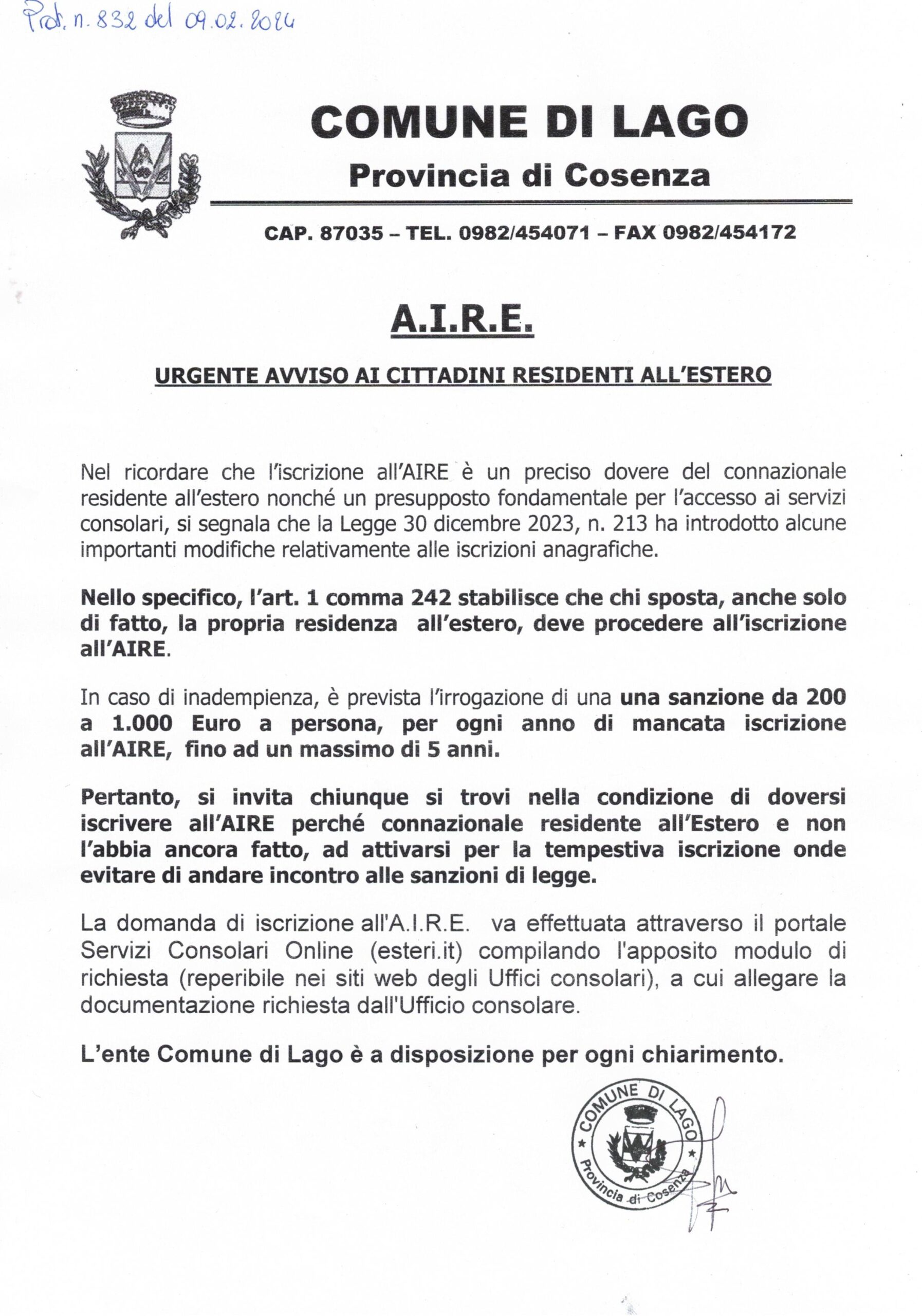 L’ente Comune di Lago è disponibile per chiarimenti.