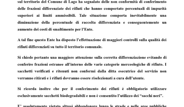 L’apertura delle offerte per il taglio e la vendita del materiale retraibile del Bosco Verzi, verrà effettuata in data 14 luglio alle ore 11:00 presso la Sala Consiliare del Comune di Lago
